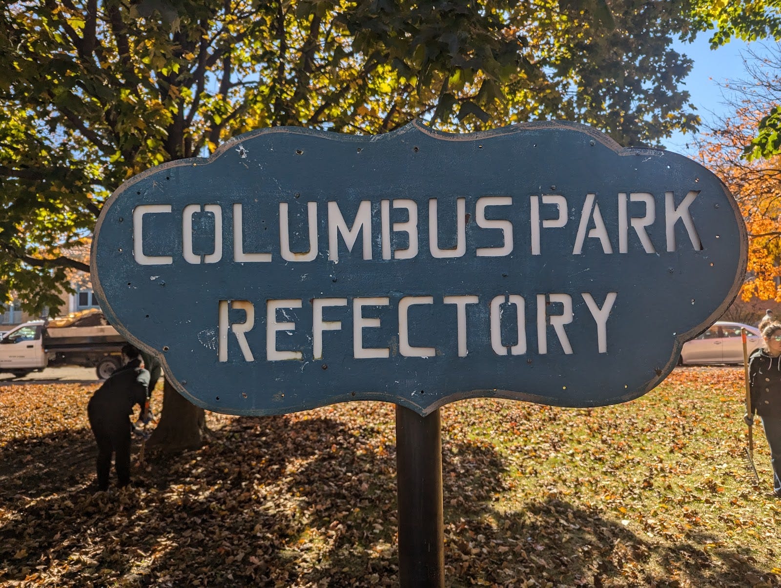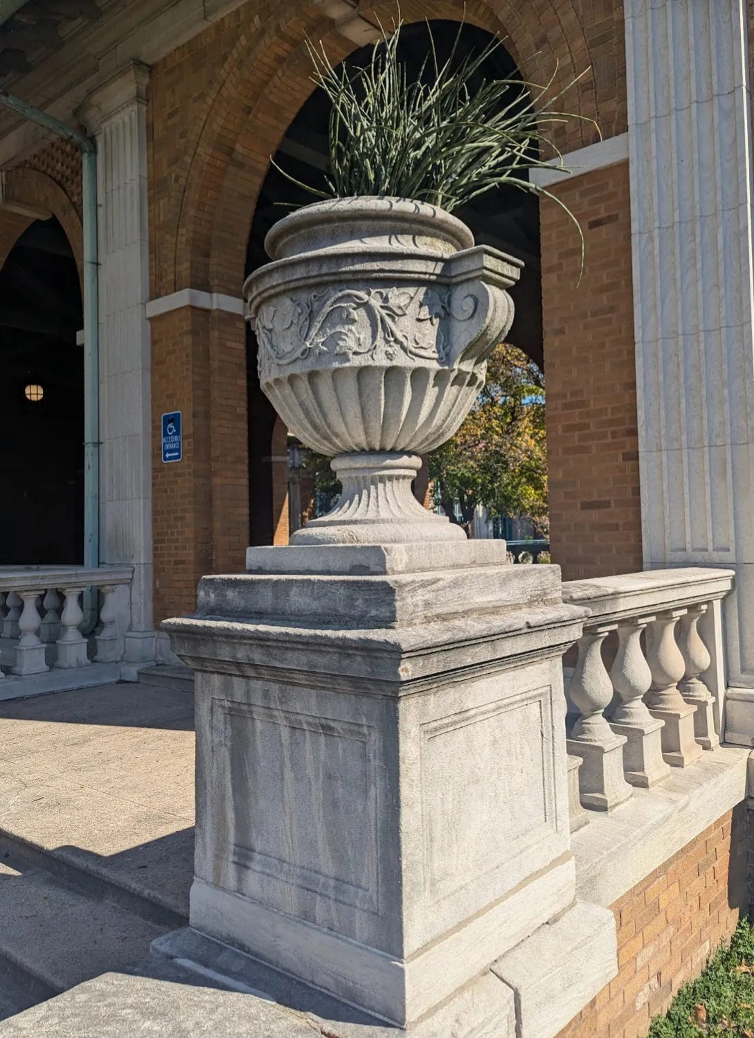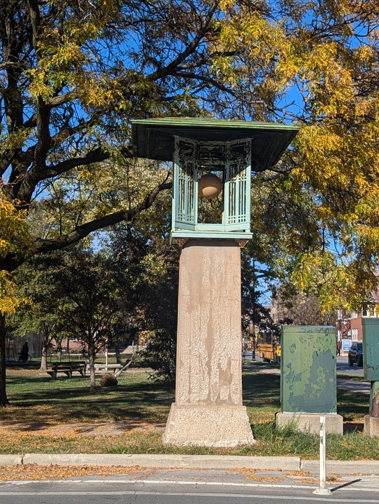 Above, are massive lanterns at the east entrance of Columbus Park designed by Schmidt, Garden & Martin.