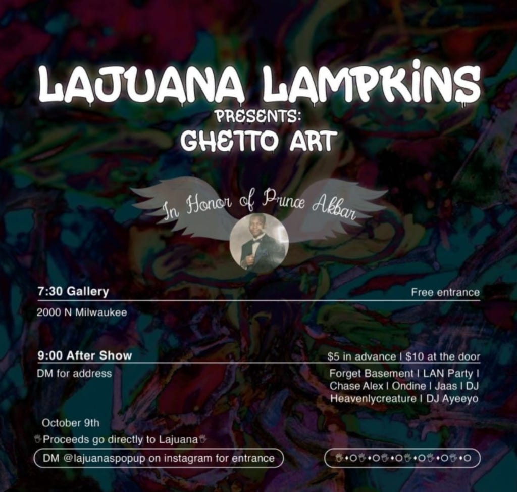 Arte Agora artist Lajuana Lampkins had a gallery show last Friday night. The show was organized by leaderofbugs through lajuanaspopup and was called, "Lajuana Lampkins presents: Ghetto Art, in honor of Prince Akbar"