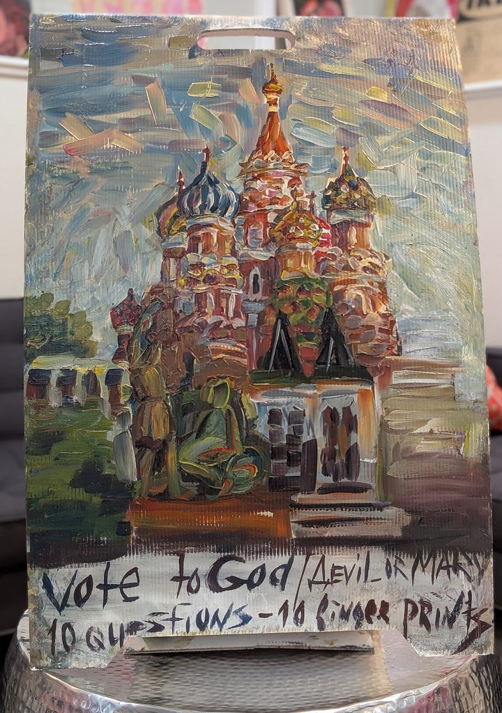 I located Tatiana inside a coffee shop adjacent to her cart (with the kind help of another coffee shop denizen), where she sat drawing. I was holding the hand-selected painting when I approached her, and in Russian-inflected English, she asked why I had touched it. I explained that I wanted to buy the painting, but she told me it was priceless, and not for sale.