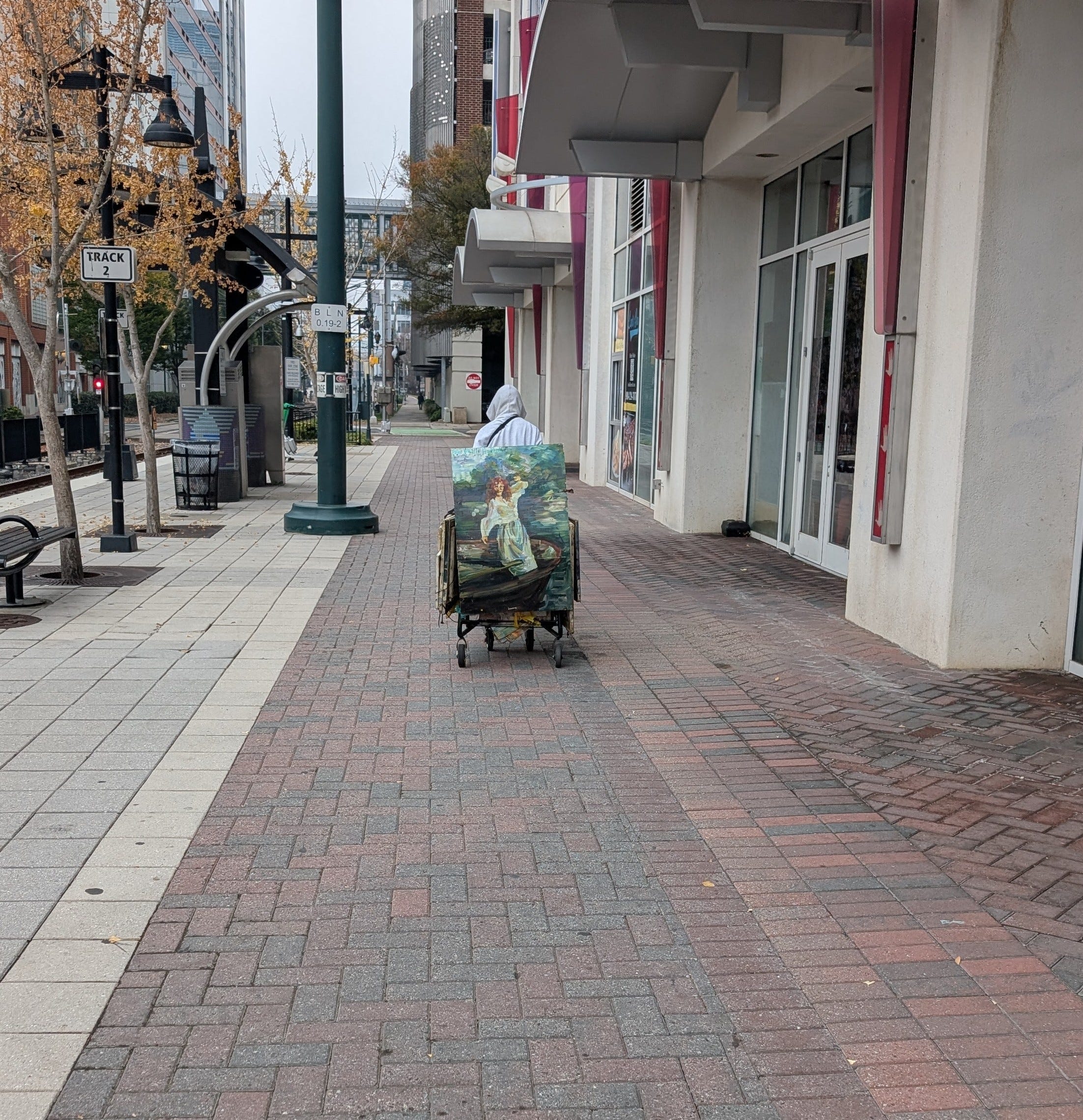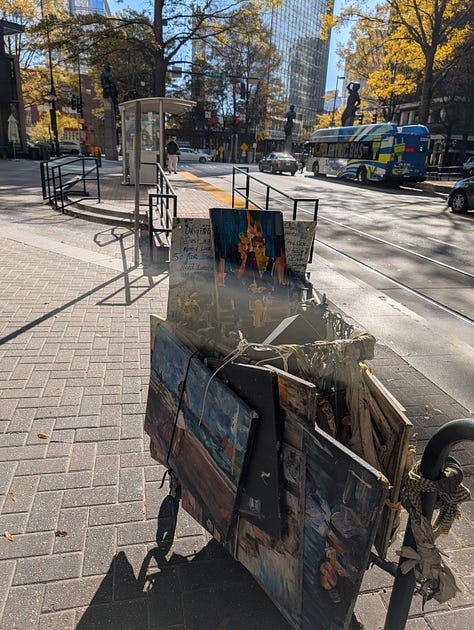 On the corner of some public property, she lives in a tent sort of lean-to with an amazing hand-painted tri-fold cardboard “screen” that serves as the door. I did not take photos because that felt far too intrusive on her personal space. But meeting her at her spot, I also then understood why she brings her “priceless” canvases with her as she slowly makes her way through the city of Charlotte.