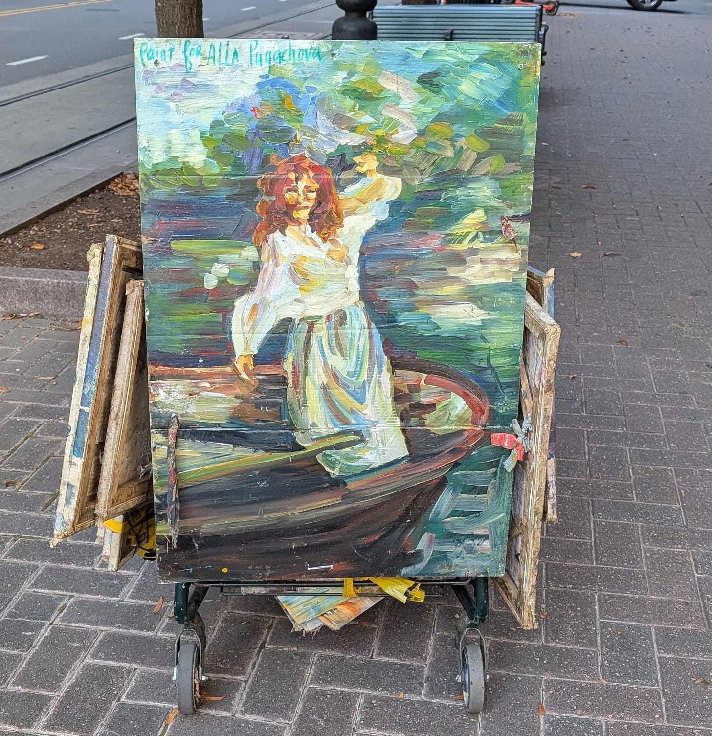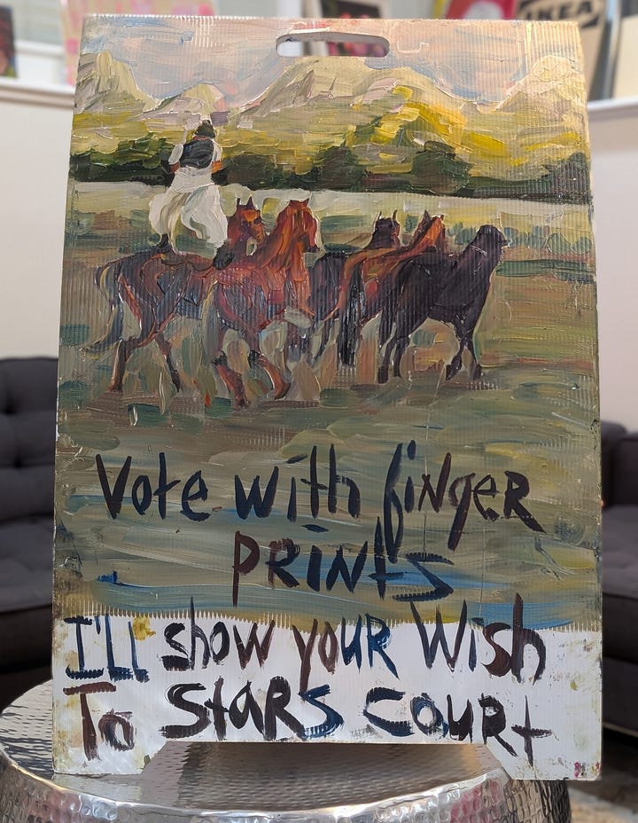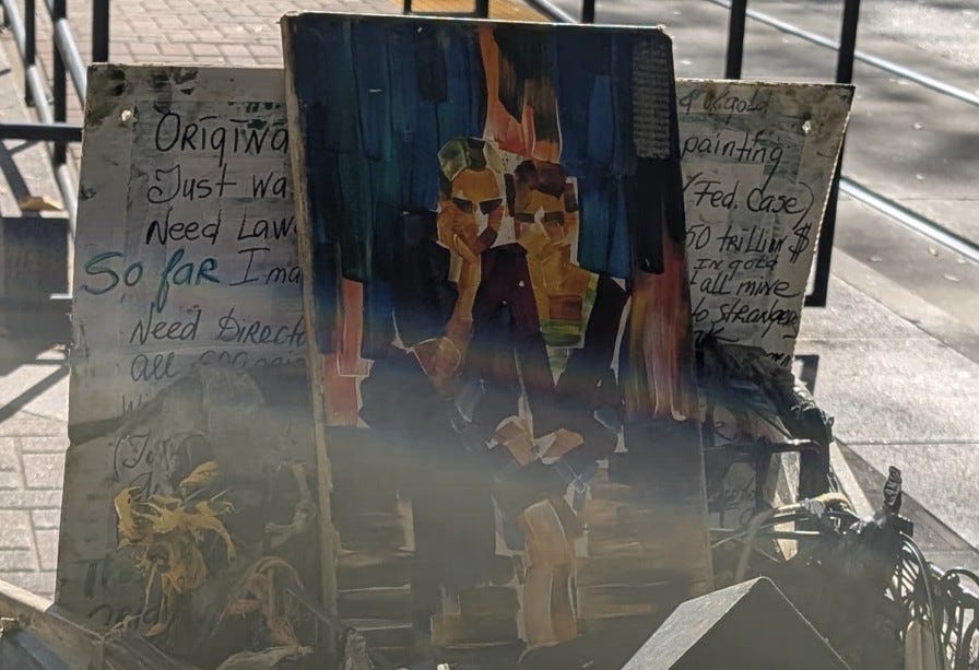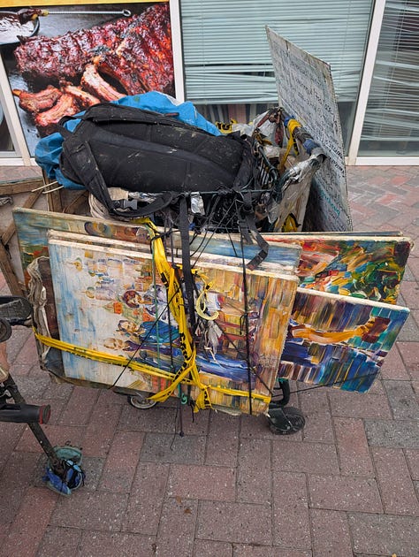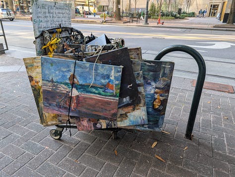 Two days later, Dan saw her again, and this time, rather than touch any of her work, he simply handed her money and said he would like to buy some of her art. Once again, the art in her cart was off limits, but she gave an address of where to meet her in a couple of hours and said we could pick out something.